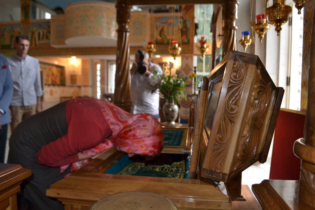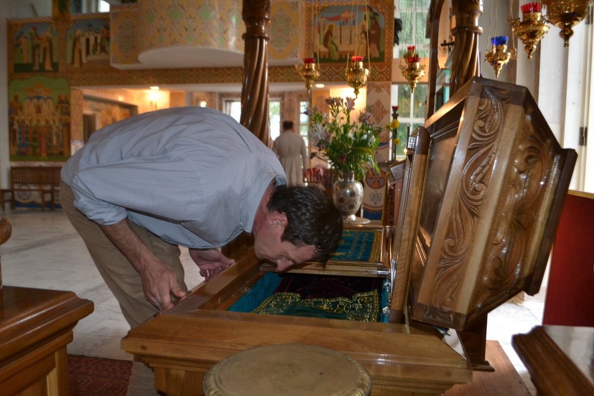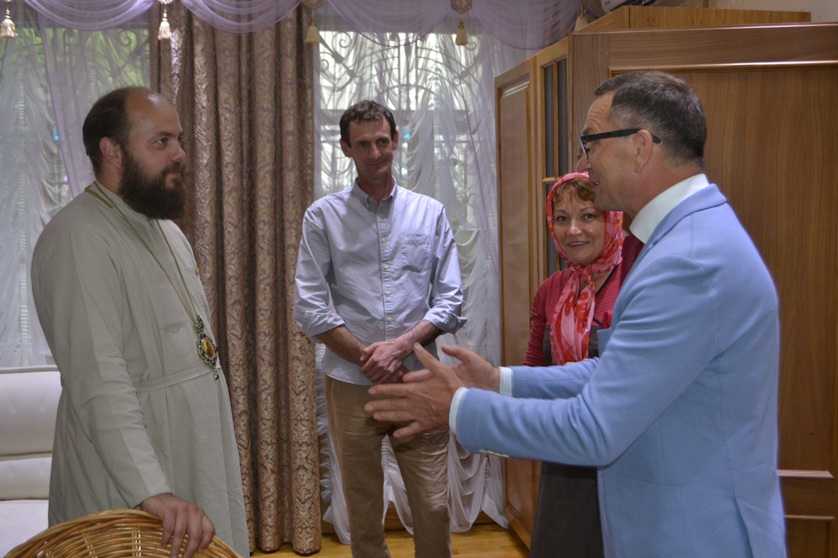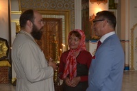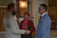 По завершении встречи, Его Преосвященство пригласил гостей в Алексеевский придел Свято-Воскресенского собора, к раке преподобноисповедника Ираклия Иссык-Кульского. Владыка Даниил рассказал о преподобном Ираклии, как о небесном покровителе Среднеазиатского Митрополичьего округа, после чего гости смогли приложиться к его святым мощам и помолиться о мире на Украине.