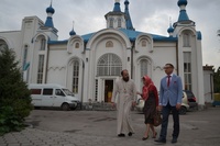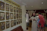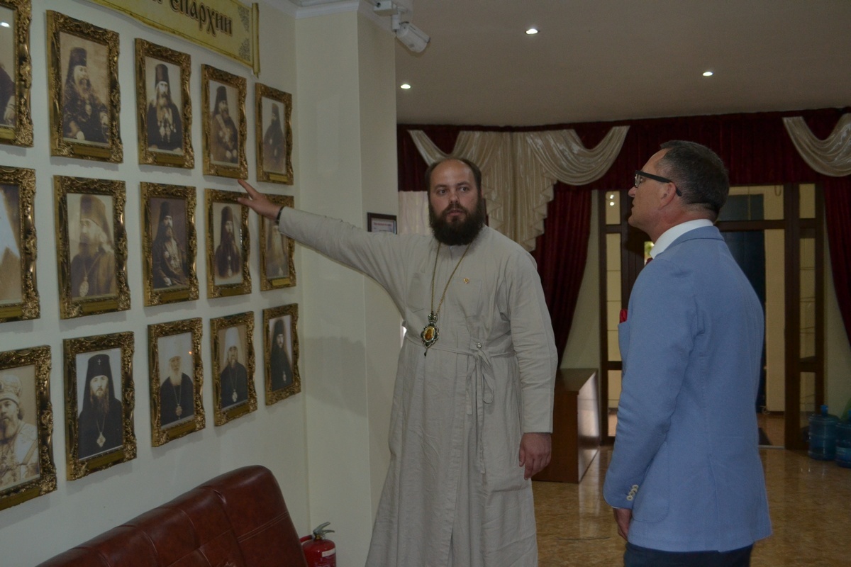 По выходе из епархиального управления, владыка предложил гостям остановиться возле стенда с фотографиями Туркестанских архипастырей и провел небольшой исторический экскурс о создании и развитии Туркестанской епархии от момента ее возникновения и об архиерейских трудах, положенных на ее благо и процветание, уделив особое внимание личностям святителей Димитрия (Абашидзе) и Луки (Войно-Ясенецкого).