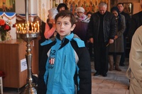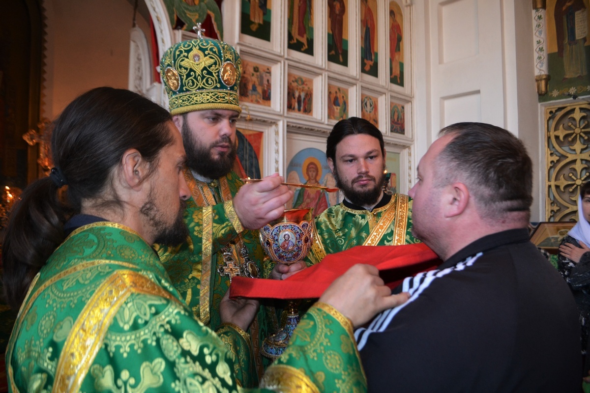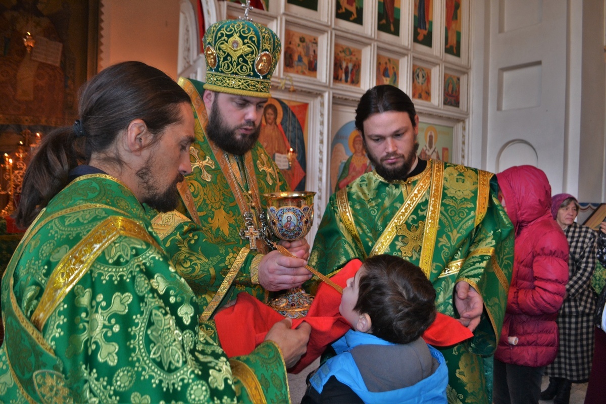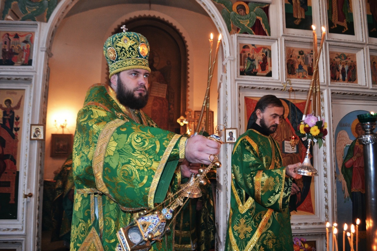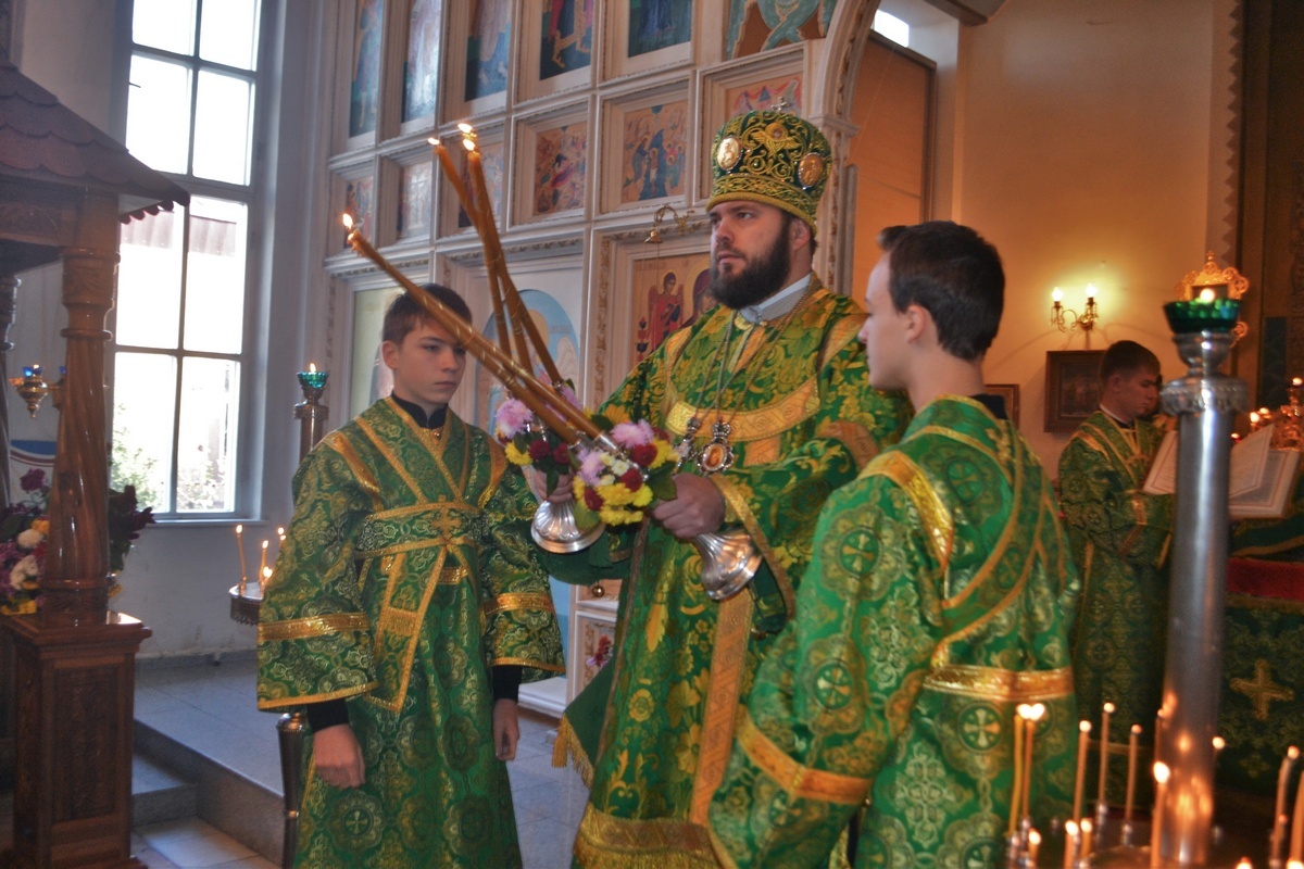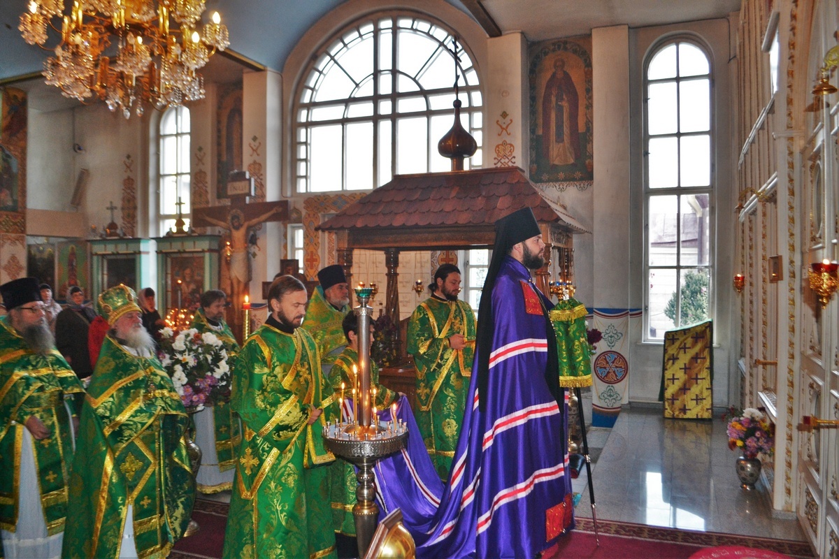 Его Преосвященству сослужили: митрофорный протоиерей Валентин Никонов, настоятель Владимирского храма протоиерей Алексий Зайцев, иерей Георгий Дворовой, иерей Афанасий Карюгин.