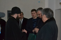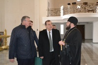Главу Таможенной службы с сопровождающими его Послом Российской Федерации и членами аппарата Президента КР встретил и проводил в храм епископ Бишкекский и Кыргызстанский Даниил. Провожая делегацию по храму, Его Преосвященство рассказал о проведении последних работ, предваряющих освящение престола и начало регулярных богослужений. В алтаре храма владыка Даниил вручил высокому российскому гостю резную картину из дерева ручной работы с изображением Владимирского собора.