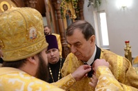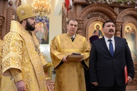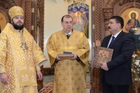 Епископ Бишкекский и Кыгызстанский Даниил поздравил с освящением Владимирского храма Андрея Крутько, посла Российской Федерации, более 3 лет возглавляющего дипломатическое представительство России, и вручил ему Патриаршую награду – юбилейную медаль святого равноапостольного великого князя Владимира, выпущенную в ознаменование 1000-летия преставления великого крестителя Руси.
