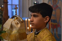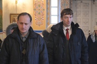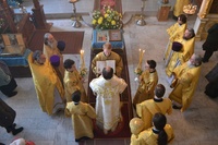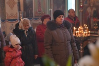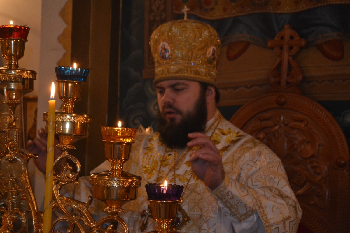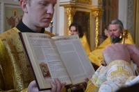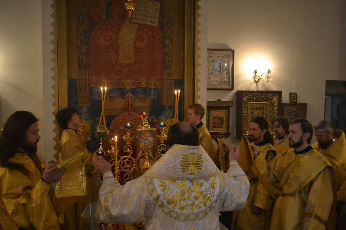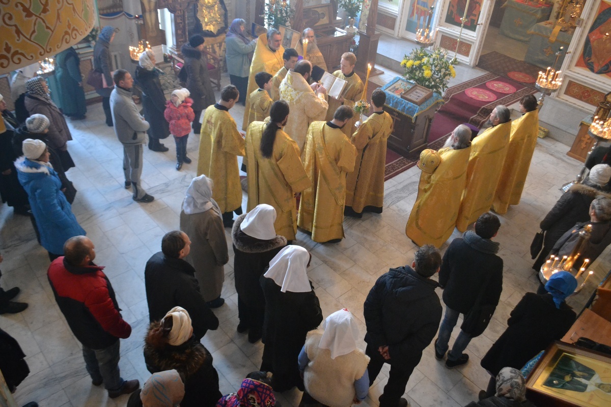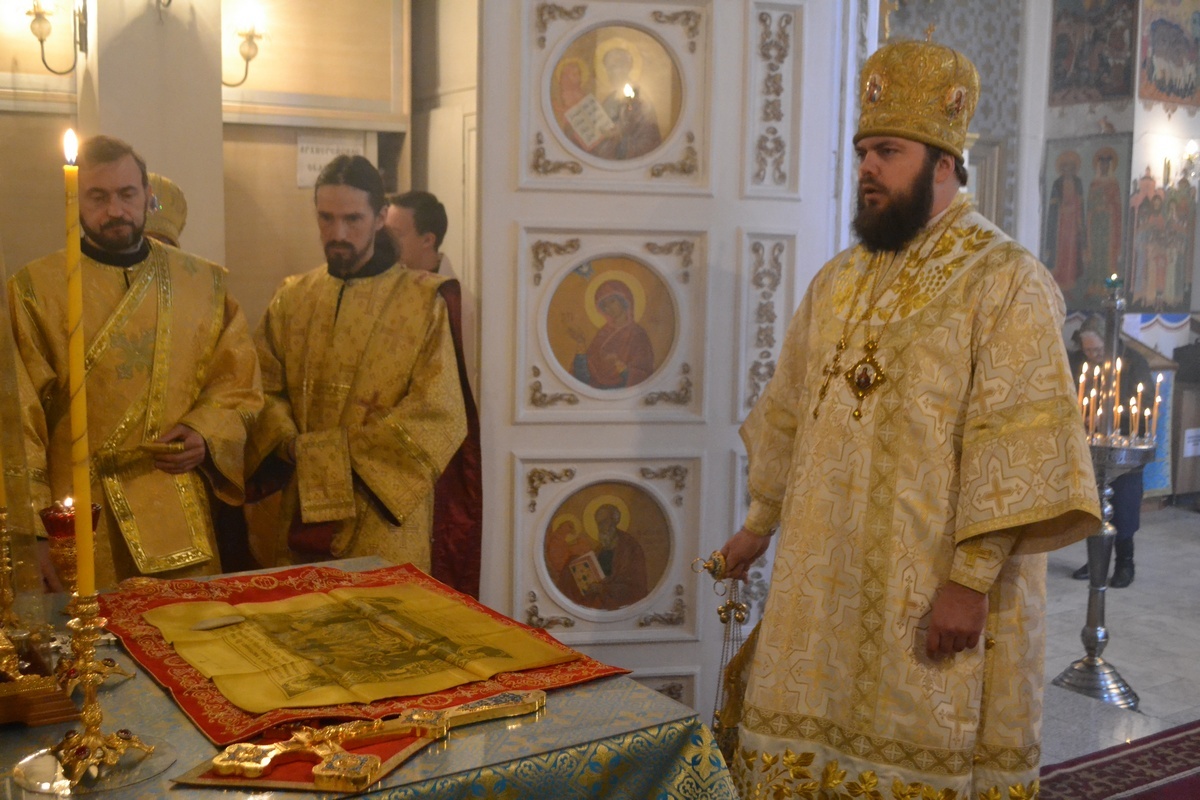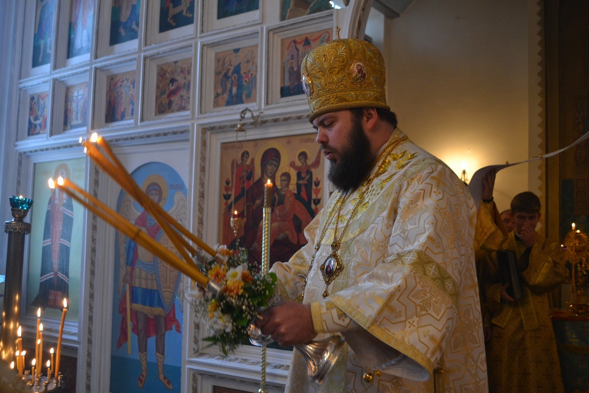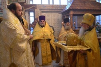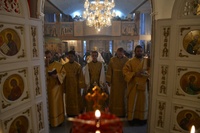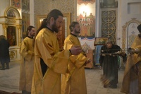 Его Преосвященству сослужили: митрофорный протоиерей Валентин Никонов, протоиерей Алексий Зайцев, протоиерей Александр Белоусов, иерей Георгий Дворовой, иерей Олег Белотуркин.