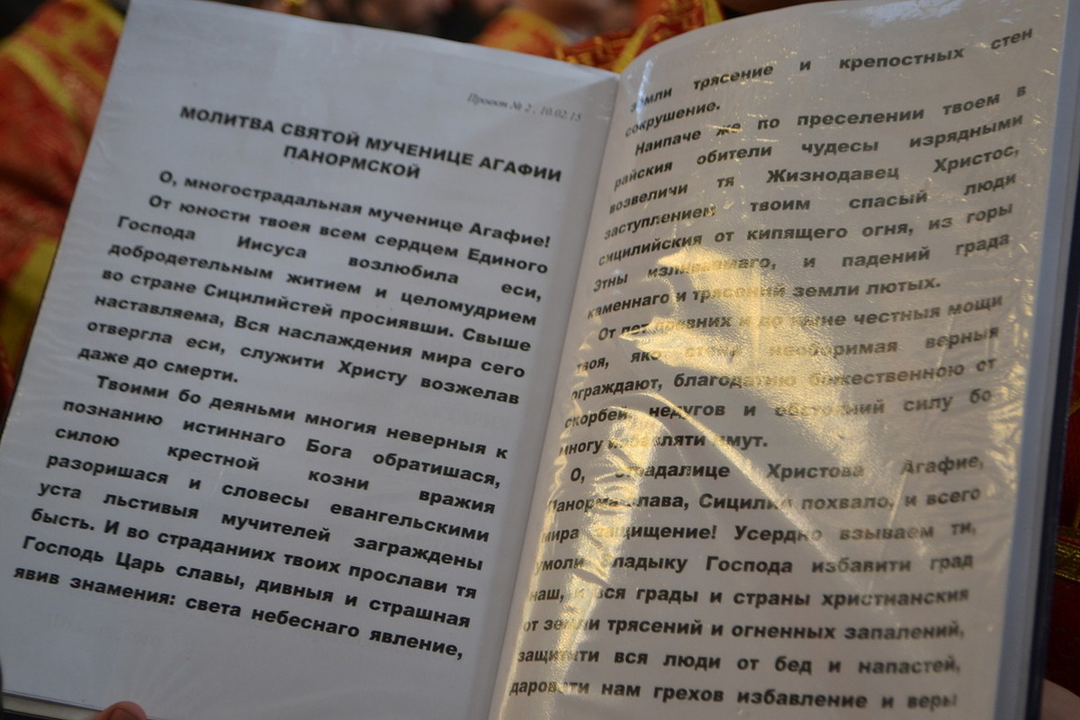 В завершение Литургии состоялось славление празднику Сретения Господня и мученице Агафии Палермской с особыми прошениями на ектении о сохранении Алма-Аты и Казахстана от землетрясений, пожаров и иных стихийных бедствий. Перед ковчегом с мощами страдалицы Христовой была произнесена молитва святой Агафии с ходатайством «избавити град Алма-Ату, и вся грады и страны христианския от земли трясений и огненных запалений, защитити вся люди от бед и напастей, даровати грехов избавление и веры Православныя утверждение».