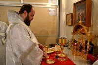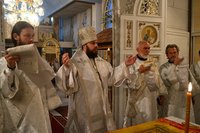Его Преосвященству сослужили: протоиерей Андрей Кунавин благочинный Бишкекского округа, протоиерей Андрей Борисенко настоятель храма святого праведного Иоанна Кронштадтского, клирики Свято-Воскресенского собора иерей Георгий Дворовой, иерей Олег Белотуркин.