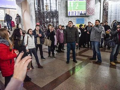 Более 50 человек вместе с группой «Ярилов зной», ансамблями «Братья казаки» и «Русален» спели на Киевском вокзале известную украинскую песню «Распрягайте, хлопцы, коней».
